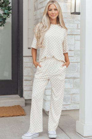 Khaki Checkered Print Half Sleeve Tee 2pcs Lounge Pant Set