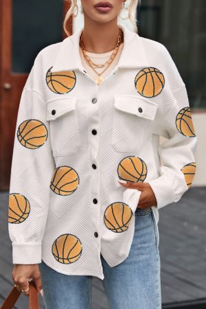 Beige Sequin Basketball Graphic Textured Snap Button Shacket