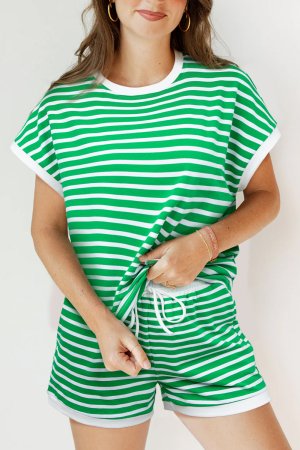 Dark Green Striped Cap Sleeve Tee and Shorts Set